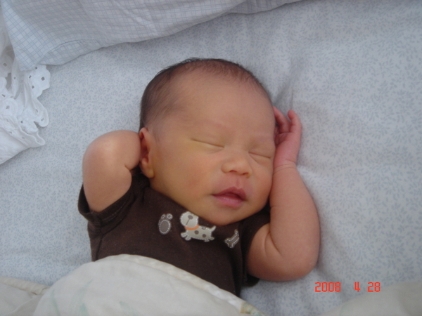 早先媽媽讓他側著睡﹐因為常常放他下來就是這個姿勢﹐