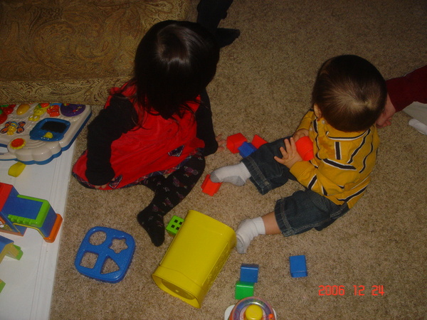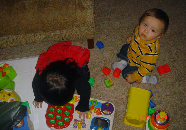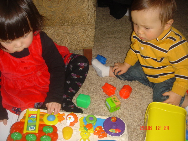 聖誕夜我們去堂妹Esther家吃大餐﹐可愛的Zachary已經九個月大﹐可以和小小排排坐著玩了。